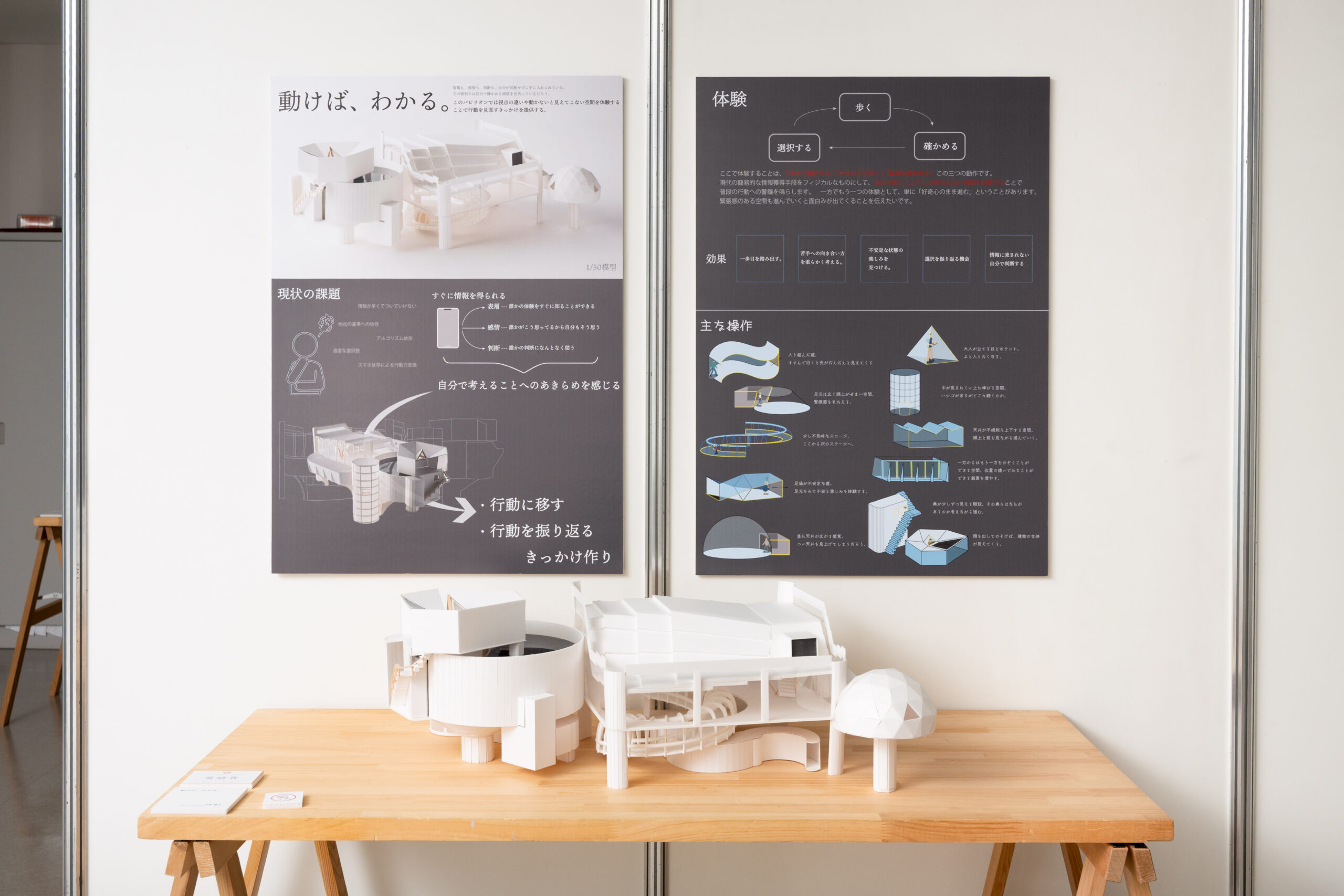 本作品では、行動すること、そして行動を振り返ることの重要性を空間体験を通して伝えるパビリオン提案です。情報や判断、感情までもが容易に与えられる現代社会に違和感を抱き、それに対して自ら「考え、選択し、確かめること」の価値を問い直します。来場者は実際に歩き、道を選び、異なる視点や構造に辿り着くことで、自身の行動軌跡を体感的に理解していきます。画面の中では完結しない「動くことで初めてわかる体験」を通じて、主体的に世界と関わる楽しさと可能性を提示する空間です。